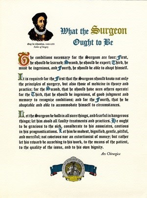 In 1951, the American College of Surgeons received a beautifully embossed scroll from Robert P. Dobbie, MD, FACS, professor of clinical surgery, University of Buffalo, NY, and attending surgeon, Buffalo General Hospital. Dr. Dobbie was planning to present a framed copy of the scroll, printed with the words of surgeon Guy de Chauliac and titled “What the Surgeon Ought to Be” to young graduating resident surgeons. Expressing his appreciation for the theme’s “brevity, comprehensiveness, and adequacy, greatly enhanced by its source and the date of its origin,” Dr. Dobbie believed the statement was a potential influence for good, especially among new surgeons.1