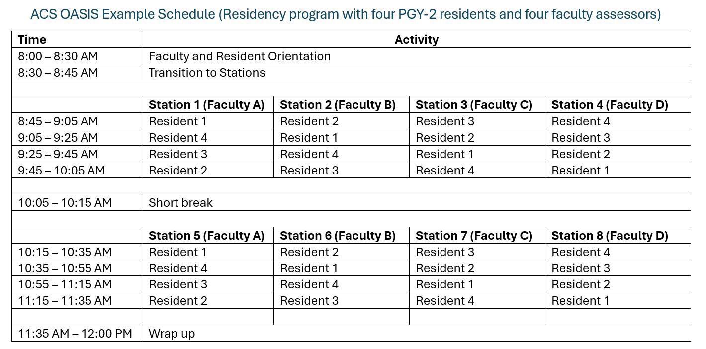 View an example schedule for the administration of ACS OASIS for a residency program with four PGY-2 residents and four faculty assessors.