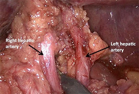 Figure 3. Demonstration of the hepatic arterial bifurcation during hepatoduodenal ligament dissection.