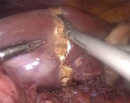 Dense adhesions to the gallbladder are then taken down. These adhesions usually occur as a result of repeated episodes of cholecystitis or cholangitis. Bleeding is common due to active inflammation and fusion of tissues. It is important not to leave omentum on the gallbladder. Some tissue surface bleeding is often encountered, due to the inflammatory response, and bipolar cautery is ideal to control such bleeding.
