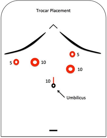 Figure 2. Proper trocar placement when planning for a laparoscopic liver resection. Notice that the 10mm port in the right midclavicular position is placed higher than usual to accommodate the short CUSA instrument.