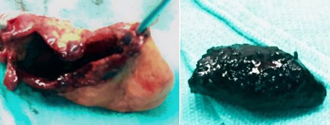 Surgical findings included several liters of bloody ascites, intra-abdominal hematoma, and a ruptured gallbladder with free spillage of bile and a large gallstone into the abdominal cavity (Figure 2).