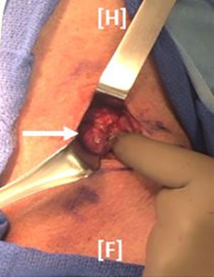 Figure 2: Operative exploration was performed via a Kocher incision. On retraction of the sternothyroid muscle, a lesion (white arrow) was noted lateral to the inferior pole of the left thyroid lobe.