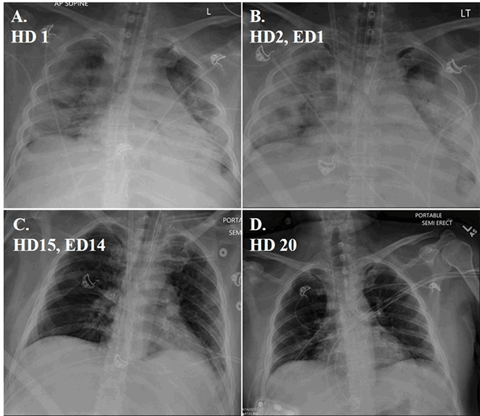 Figure 1. Serial CXR of SARS-Cov2 pneumonia recovery. (A) Hospital Day (HD) 1; (B) HD 2, ECMO Day (ED) 1; (C) HD 15, ED 14, day of decannulation; (D) HD 20.