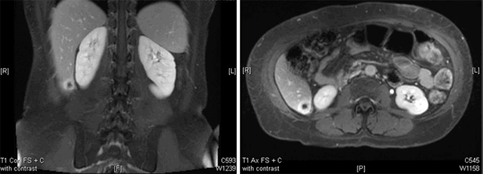 A MRI abdomen performed in July 2018 confirmed a segment six enhancing subcapsular lesion approximately 23 x 22 x 21 mm suspicious for a primary liver malignancy such as hepatocellular carcinoma or a hepatic metastasis (Figure 2).