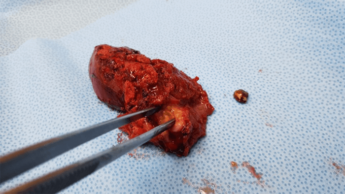 Figure 3. Intraoperative specimen examination of segment 6 liver resection with associated cholelithiasis shown.