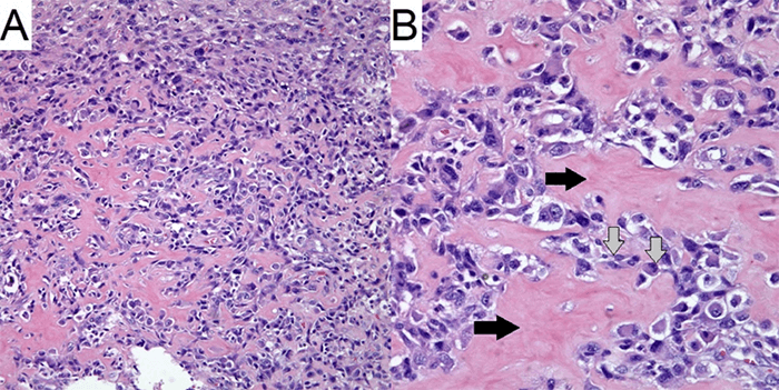 Figure 2. A) Malignant pleomorphic tumor cells with osteoid production (H&E low power magnification). B) pleomorphic tumor cells (gray arrows) with osteoid matrix (black arrows) (H&E high power magnification).