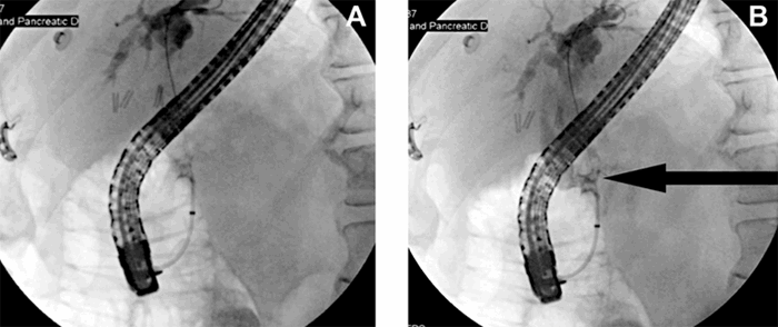Figure 1. ERCP cholangiogram; arrow points to site of porto-biliary fistulous tract