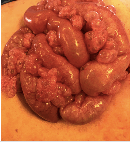 This patient underwent a non-therapeutic laparotomy which revealed extensive emphysematous blebs along the small bowel (Figure 2). Intraoperatively, we immediately noted multiple emphysematous protrusions from the bowel without pneumatosis of the bowel. On palpation of the blebs, the air in them did not appear to connect to the bowel itself. We inspected the small bowel from the ligament of Treitz to the terminal ileum, only noting the multiple emphysematous protrusions. There was no evidence of bowel compromise. It appeared that most of his presumed extramural air was due to the blebs outside of the bowel and any small amount of free air notable on imaging was due to a ruptured bleb. Given his ulcer history, we elected to perform an intraoperative esophagogastroduodenoscopy (EGD) with methylene blue chromoendoscopy through the third portion of the duodenum. There was no evidence of perforation, ulcer, or mucosal compromise. We insufflated the stomach and duodenum with no bubbling of irrigation in the abdomen.
