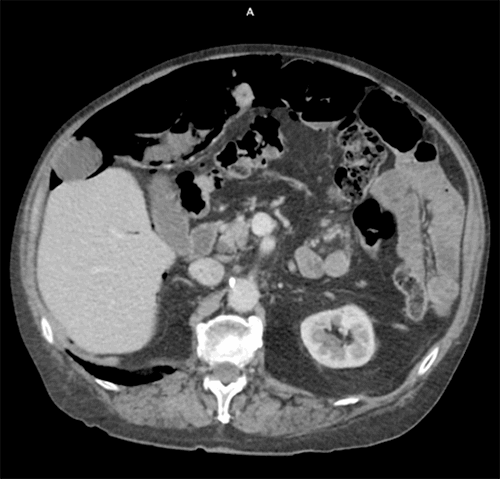 The case we present here describes a patient who warranted surgical intervention due to concomitant pneumoperitoneum. This case illustrates an example of radiologically identified PI with surgical intervention. A 73-year-old man presented to the emergency department (ED) with ten days of epigastric pain and one dark, tarry bowel movement the previous night prompting his ED visit. He had complained of epigastric pain to his primary care physician (PCP) just days prior, who started him on a proton pump inhibitor which failed to relieve his symptoms. He denied any other changes in bowel movements, and his medical history was significant for GI bleeding 25 years previous secondary to excessive NSAID use, which was diagnosed as peptic ulcer disease and quickly resolved after discontinuation. His most recent colonoscopy was one year before presentation with one benign polyp. He was adherent to a chronic course of prednisone 10 mg daily for the management of polymyalgia rheumatica.
