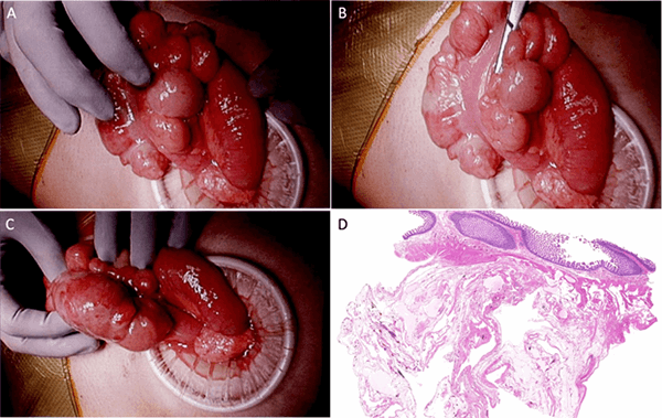 Figure 2. Gross pathology. A) Laparoscopic findings of distal ileal mass. B, C) Intraoperative photographs showing dilated distal ileum and fatty lobulated pink mass originating from small bowel mesentery. D) Histology: Low-power scanning magnification hematoxylin and eosin staining showing the subserosal based lesion extending into the mesentery