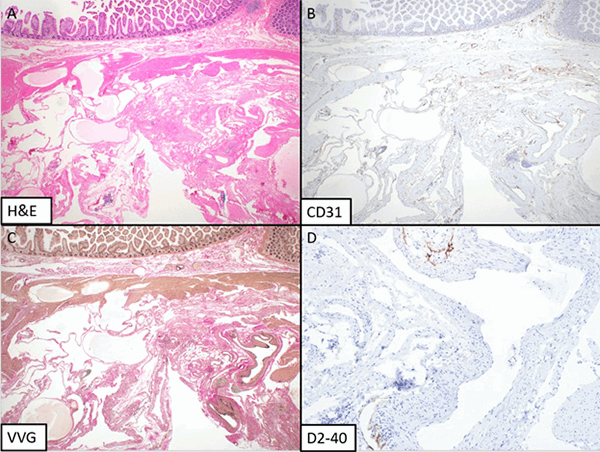 Figure 3. Histology highlighting vascular malformation marker positivity of CD31 and Verhoeff’s-van Geison (VVG), but negative D2-40 staining. A) Higher power hematoxylin and eosin staining of subserosal-based lesion. B) CD31, which stains all vascular endothelium. C) VVG, which stains elastic fibers in arterial walls. D) D2-40, which specifically highlights lymphatic endothelium