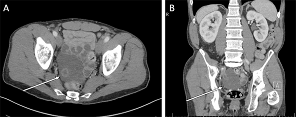 Figure 1. Preoperative computed tomography (CT) imaging. A) Axial imaging showing presence of multi-loculated, cystic abdominal lesion(white arrow pointing to pelvic mass). B) Coronal view of same abdominal CT scan (red arrow pointing to partially visualized appendix)