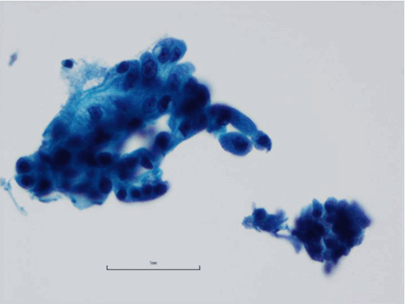 Figure 2. Cytologic brushings with atypical cells obtained from the distal common bile duct after percutaneous transhepatic catheter placement