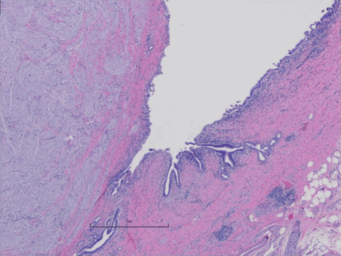 In this case, a prior gastric bypass precluded a successful attempt at standard endoscopic evaluation and biopsy with ERCP and EUS. Biliary drainage was ultimately accomplished through a percutaneous transhepatic route. Cytologic brushings of the distal bile duct were performed, and the suspicion for malignancy existed based on histopathologic findings. We discussed alternatives and additional workup, such as transgastric ERCP/EUS, with or without cholangioscopy, either by the percutaneous or laparoscopic-assisted approach. Given her prior complex open surgical history, we felt the likelihood of accomplishing the additional workup in a minimally invasive fashion would be low. Additionally, given the suspicious cytopathologic findings on percutaneous brushings and elevated CA19-9, we felt we could not rule out an invasive malignancy definitively, and pathologic discordance would create confusion and diagnostic dilemma. As with previously described cases as that of Watanabe et al.,10 this patient was offered pancreaticoduodenectomy with bilioenteric reconstruction. To the authors’ knowledge, this represents the first case report in English literature of a bile duct neuroma in the setting of a prior gastric bypass requiring pancreaticoduodenectomy.