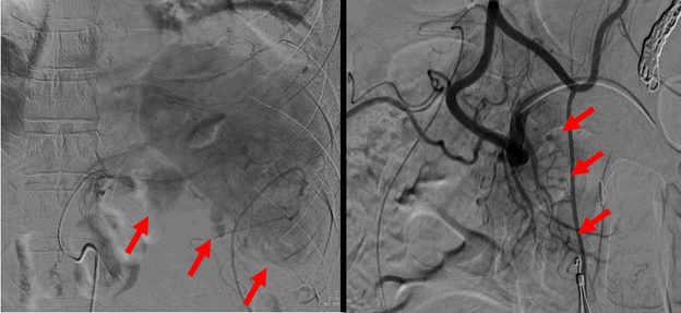The patient was admitted to our hospital's surgical intensive care unit hemodynamically stable with initial hemoglobin of 10.8 g/dL. He was urgently brought to the interventional radiology (IR) suite, where conventional angiography identified three pseudoaneurysms of the splenic artery. Successful coil angioembolization of all three visceral artery pseudoaneurysms (VA-PSA) was achieved. Repeat CECT two days later identified three additional VA-PSA arising from the superior pancreaticoduodenal arcade (PDA). All three VA-PSA were successfully angioembolized with a second angiographic procedure (Figure 2).
