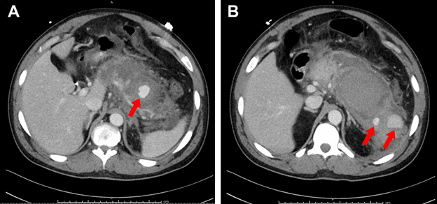 No formal consensus exists regarding the surveillance and follow-up strategy for patients with VA-PSA secondary to NP. In this report, the patient returned to the clinic for follow up and CECT two weeks after discharge and in fact, was suspected of having another VA-PSA. Angiography was performed; however, no PSA was identified. Since then, the patient has followed up with CECT and clinic visits at increasing interval duration. We recommend a similar approach based on the patient's clinical progression and objective radiological and laboratory findings.