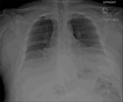 A 72-year-old man presented to the emergency department with shortness of breath, dyspnea on exertion, a hacking, productive cough, and left-sided chest pain. He had no history of trauma. He had a 50-pack/year smoking history and continued to smoke after being placed on home oxygen. His admitting chest radiograph revealed a small left pleural effusion and changes consistent with COPD (Figure 1). A previous chest radiograph was reviewed and revealed only changes of COPD and no evidence of left diaphragm eventration. He was hospitalized for nebulizer therapy, acute administration of intravenous steroids, and to rule out an acute coronary syndrome. During his admission, he began complaining of abdominal distension and constipation and continued to have a chronic cough. On physical examination, he was obese (BMI 33.7 kg/m2) with a pulse of 102 and labored breathing. Chest auscultation revealed diffuse rhonchi with diminished breath sounds at the left lung base. His abdomen was distended, tympanitic, and diffusely tender. There was ecchymosis along the left flank extending to the left lower quadrant, consistent with Grey Turner sign. Laboratory studies revealed a white blood cell count of 18,300/μL, and arterial blood gas showed a pH of 7.34, pCO2 of 42 mmHg, and pO2 of 60 mmHg on 5 L/min by nasal cannula. An electrocardiogram demonstrated sinus tachycardia but no ischemia. A plain film now revealed loops of bowel in the left hemithorax (Figure 2).
