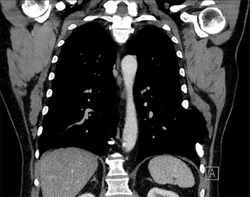 Figure 4. Contrast-enhanced CT of the chest two years postoperatively showing an intact left diaphragmatic repair