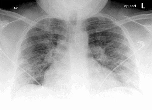 Figure 1. Chest X ray of the patient on initial presentation showing development of COVID-19 associated acute respiratory distress syndrome