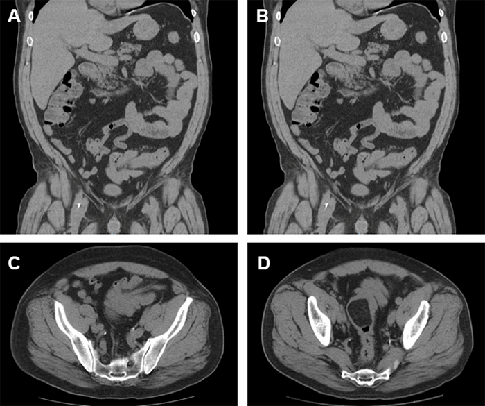 A) Coronal view of intussusception involving the proximal, mid, and distal portions of sigmoid colon; B) Coronal view of a fat density intraluminal polyp, 4.4 cm × 3.1 cm in size, in mid and distal sigmoid colon; C) Axial view of intussusception involving proximal, mid and distal portions of sigmoid colon; D) Axial view of fat density intraluminal polyp, 4.4 cm × 3.1 cm in size, in mid and distal sigmoid colon