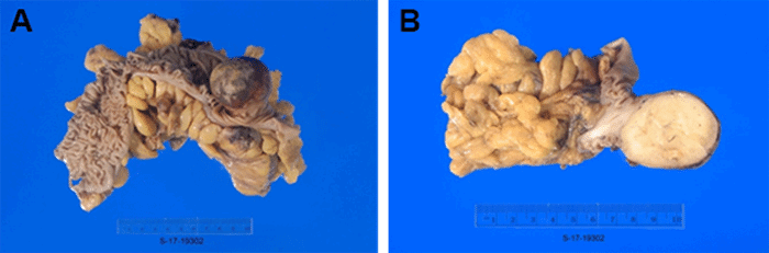 A) submucosal lipoma (5 cm in diameter) with focal fat necrosis and mucosa overlying ulceration; B) cross-section of submucosal lipoma