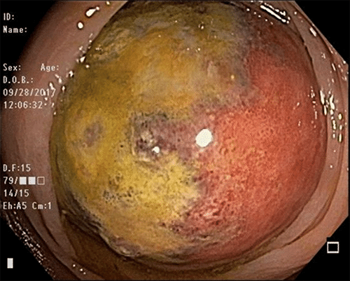 Figure 2. Endoscopic View of Sigmoid Colon At 35 Cm Demonstrating Large, Firm, Circular Mass with Normal Overlying Mucosa. Published With Permission