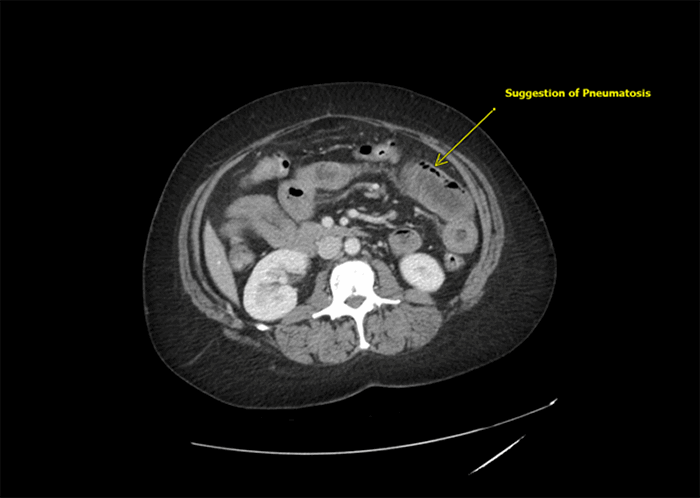 Figure 2. Axial CT of Abdomen and Pelvis with Intravenous Contrast; Suggestion of Pneumatosis Intestinalis. Published with Permission
