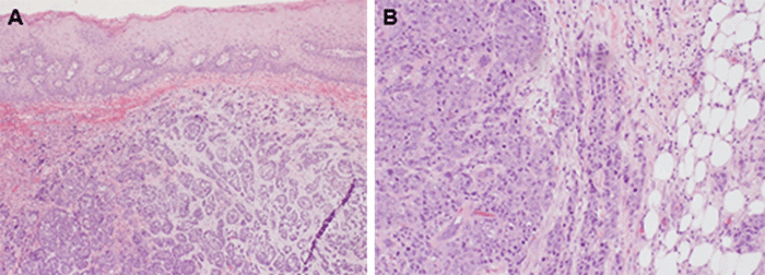 A) Original invasive ductal breast biopsy; B) Anal mass biopsy showing adenocarcinoma morphologically similar to patient's breast cancer