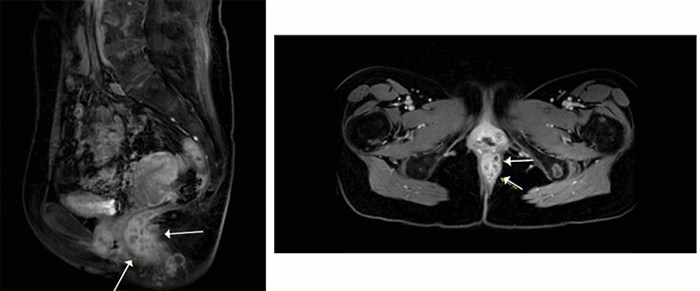 The patient was discharged two days later. and continued to receive systemic chemotherapy with doxorubicin. During her course, an MRI was obtained (Figure 3) to assess the lesion further, showing tumor involvement of the external sphincter and invasion of the ischiorectal space. Two months later, she died peacefully in her sleep.
