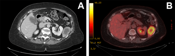 Figure 1. Solitary Lesion in Inferior Pole of Spleen on CT (A) with FDG Avidity on PET (B). Published with Permission