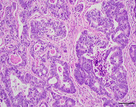 Figure 3. Section of Spleen (200x) Showing Neoplastic Cells Consistent with Metastatic Moderately Differentiated Adenocarcinoma of Colorectal Primary. Published with Permission