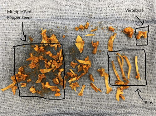 After obtaining informed consent, he was taken to the OR. A laparotomy was performed, and we delivered the small intestine easily from the abdomen and identified the mass with palpation. We manipulated the mass proximally away from the ileocecal valve, but the mass disintegrated from the external pressure. We chose to make a small enterotomy to remove the intraluminal fragments still present around the ileocecal valve. Upon entering the bowel, a copious amount of fluid was evacuated along with many small objects that appeared to be pepper seeds and small bones. There appeared to be an identifiable vertebra and multiple ribs among the pieces that were removed. We closed the enterotomy with 3-0 silk sutures in a transverse fashion. The abdominal cavity was irrigated with large volume saline irrigation. We closed the fascia with an interrupted 0 PDS suture. The skin was left open with wet to dry dressings.