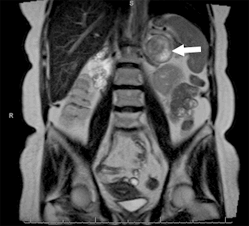 Figure 2. Coronal MRI Abdomen T2 Haste Demonstrating Left Adrenal Mass (White Arrow Indicates Mass). Published with Permission