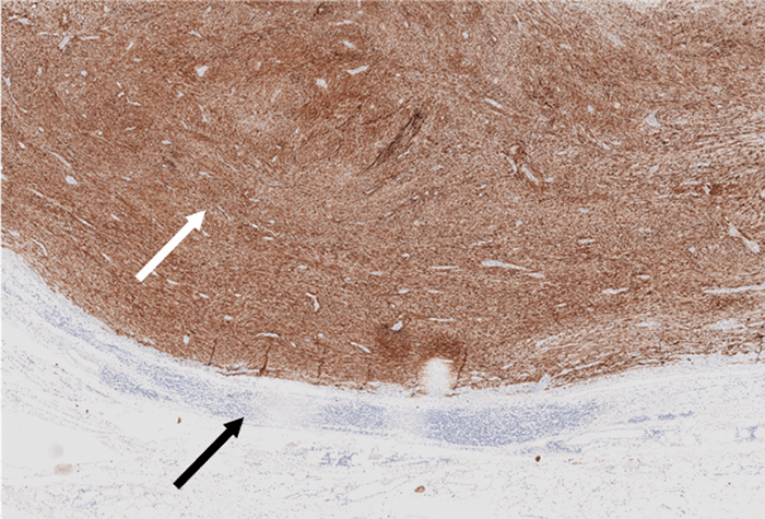 Tumor (white arrow) is diffusely positive for S100, supporting assumption of benign schwannoma; by contrast, malignant peripheral nerve sheath tumors only show focal S100 positivity—adjacent capsule and lymphatic cuff (black arrow) show no immunoreactivity