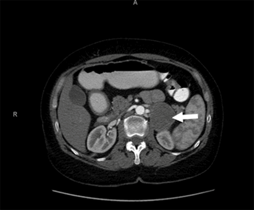Figure 1. Axial CT Angiography Abdomen Demonstrating Left Adrenal Mass (White Arrow Indicates Mass). Published with Permission