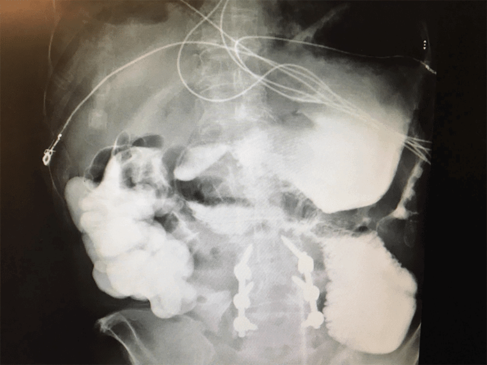 Figure 2. Contrast study via jejunal port revealing reflux of contrast into stomach. Published with Permission