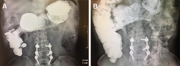 A 72-year-old male presented with one year of weight loss, diarrhea, and malnutrition after a simple gastric-small bowel side-to-side anastomosis without resection for an obstructing pyloric ulcer. His additional history included coronary artery disease with stent placement, oropharyngeal dysphagia secondary to a vocal cord injury from prior intubation, chronic back pain on narcotics, and lumbar fusion. During the year after the index operation, he sought advice at multiple academic medical centers in the United States for investigation without a satisfying diagnosis. Examination revealed a cachectic, emaciated, Caucasian male with a soft scaphoid abdomen with a well-healed midline scar. Initial imaging included an upper gastrointestinal contrast study with small bowel follow-through, revealing a patent anastomosis and contrast entering the colon within fifteen minutes (Figure 1).