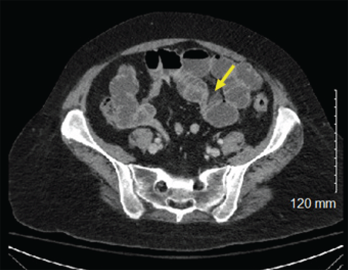 Figure 1. Axial CT Abdomen and Pelvis with Contrast Showing Dilated Loops of Small Bowel With Transition Zone in Mid-abdomen. Published with Permission