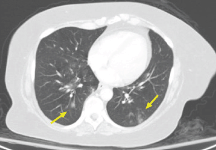 Figure 2. Axial CT Abdomen with Contrast in Lung Window Showing Bilateral Lung Bases with Nodular Opacities. Published with Permission