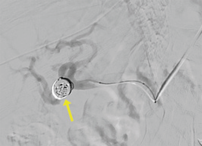 Because of the symptomatic nature of the HAA and the concern for impending rupture, the patient was admitted to the intensive care unit and then taken to the angiography suite, where an endovascular approach was taken, given her hemodynamic stability. Percutaneous access of the left radial artery was obtained, the aneurysm was identified (Figure 5) and coiled utilizing two 20 mm × 50 cm Terumo™ framing coils. Given the diameter of her RHA and the saccular morphology of the aneurysm, coils were utilized to repair the aneurysm. A covered stent was not placed due to concern that it would likely result in thrombosis and obliteration of the arterial lumen.