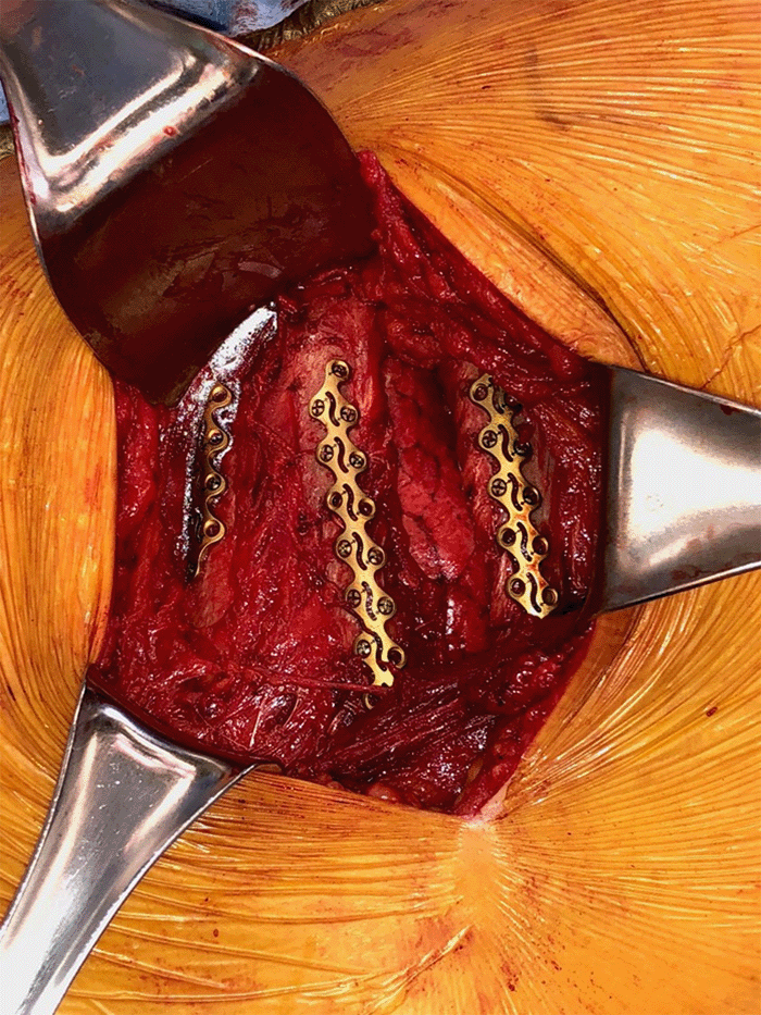 The patient was taken to the operating room. She had an obvious area of contusion and deformity over ribs 7, 8, and 9 (Figure 6). We proceeded to make a small anterolateral thoracotomy incision over that area. The lung reduced back into the pleural cavity on our initial assessment. For rib fixation (Figure 7), we used 20-hole plates. A 32 French chest tube was placed under direct vision into the pleural cavity. Finally, we used several #1 Vicryl sutures to approximate the defect between ribs 7 and 8 to avoid future lung herniation.