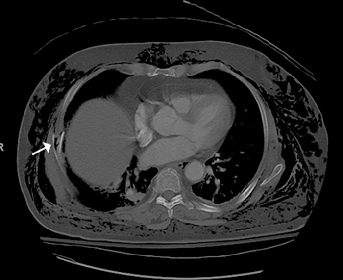 On arrival at our hospital, the patient had severe subcutaneous emphysema. She was hemodynamically normal, saturating 95% on a 3 L nasal cannula. Her imaging revealed comminuted and displaced fractures of right-sided ribs 7 through 9 (Figures 1, 2, and 3).