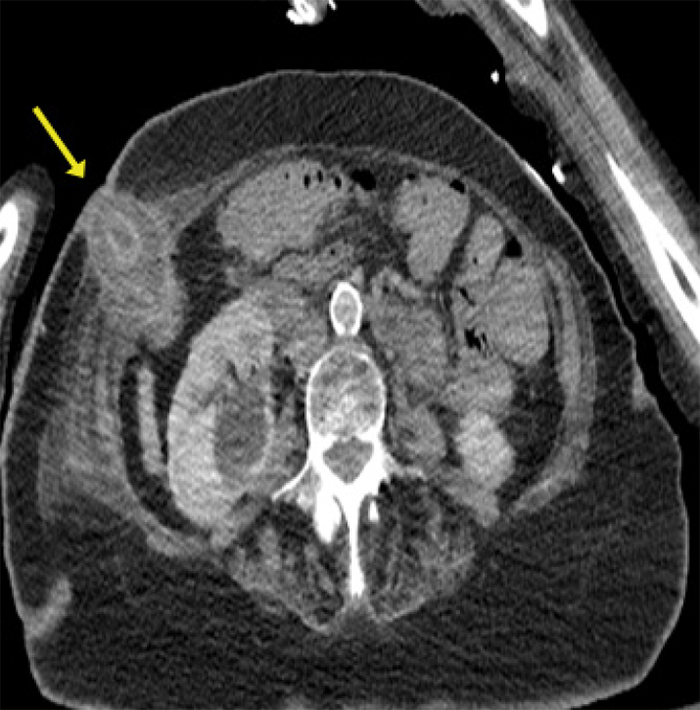 Figure 3. Axial View of CT Angiogram Demonstrating Gallbladder Herniation Through Abdominal Wall. Published with Permission