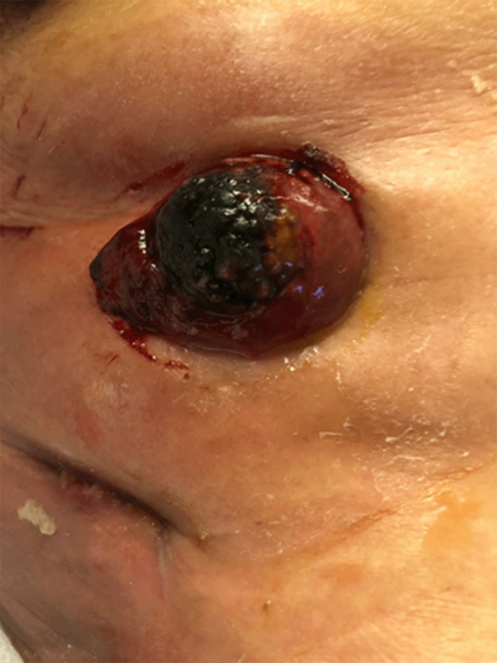 At admission, she presented to the hospital with right upper quadrant pain and an increase in the amount of drainage from her cholecystocutaneous fistula. The drainage was initially clear yellow but had changed to murky, dark green, and foul-smelling character. At the time of presentation, the patient did not have any fever, nausea, or vomiting. Physical examination revealed that the previous PCT drain site had a large gallstone impacted at the fistula opening (Figure 1). The surrounding skin was erythematous with mild excoriation and induration in the inferior aspect of her prior incision and drainage site (Figure 2).