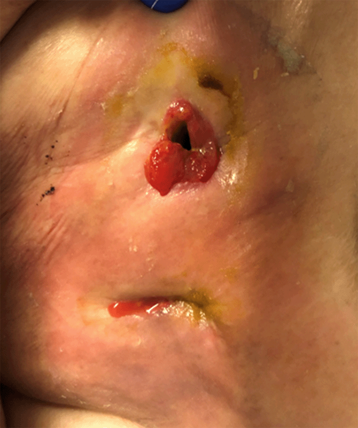 Figure 2. Cholecystocutaneous Fistula After Gallstone Dislodgement and Previous Incision and Drainage Site With Surrounding Cellulitis. Published with Permission