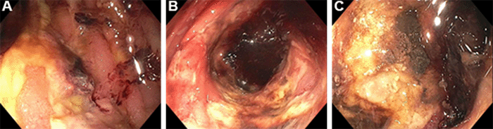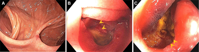 A) Duodenojejunostomy anastomosis; B) two new ulcers adjacent to hepaticojejunostomy anastomosis (yellow arrowheads); and C) increased size of ulcers on follow-up endoscopy.