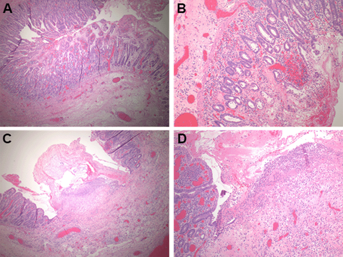 Small intestinal mucosa with partially denuded epithelium, reactive epithelial changes, and admixed acute and chronic inflammatory infiltrates, A) 40x magnification and B) 100x magnification; ulcerated small intestinal mucosa with neutrophilic and lymphoplasmacytic inflammation in background of stromal edema and prominent congested blood vessels, C) 40x magnification and D) 100x magnification