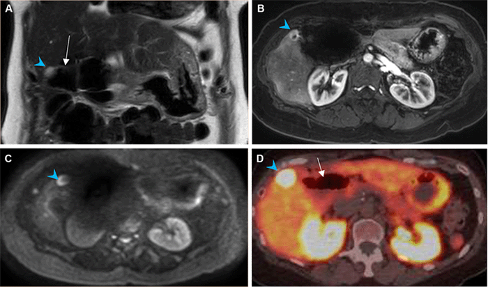A) Segment V liver lesion (blue arrowhead) hyperintense on T2 and directly adjacent to bowel (white arrow); B) enhancing on arterial phase; C) and with restricted diffusion on diffusion-weighted imaging; D) gallium-68 DOTATATE positron emission tomography/computed tomography demonstrating intense focal uptake (May 2019)