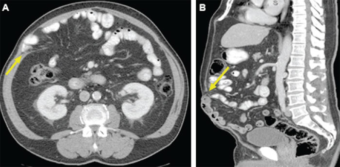 A) Recurrent ventral hernia causing partial division of left semilunar line and retraction of internal oblique muscle; B) sagittal view